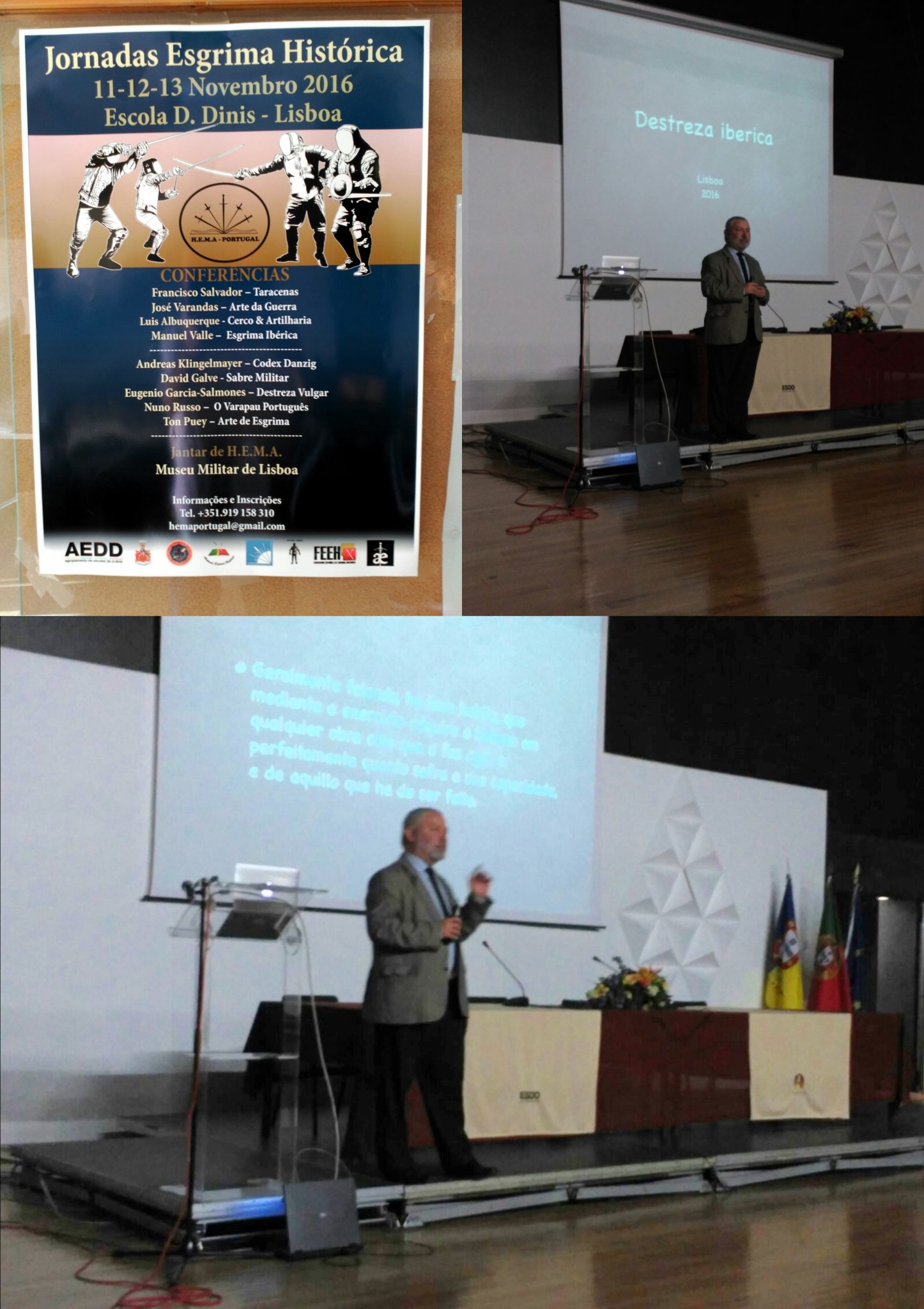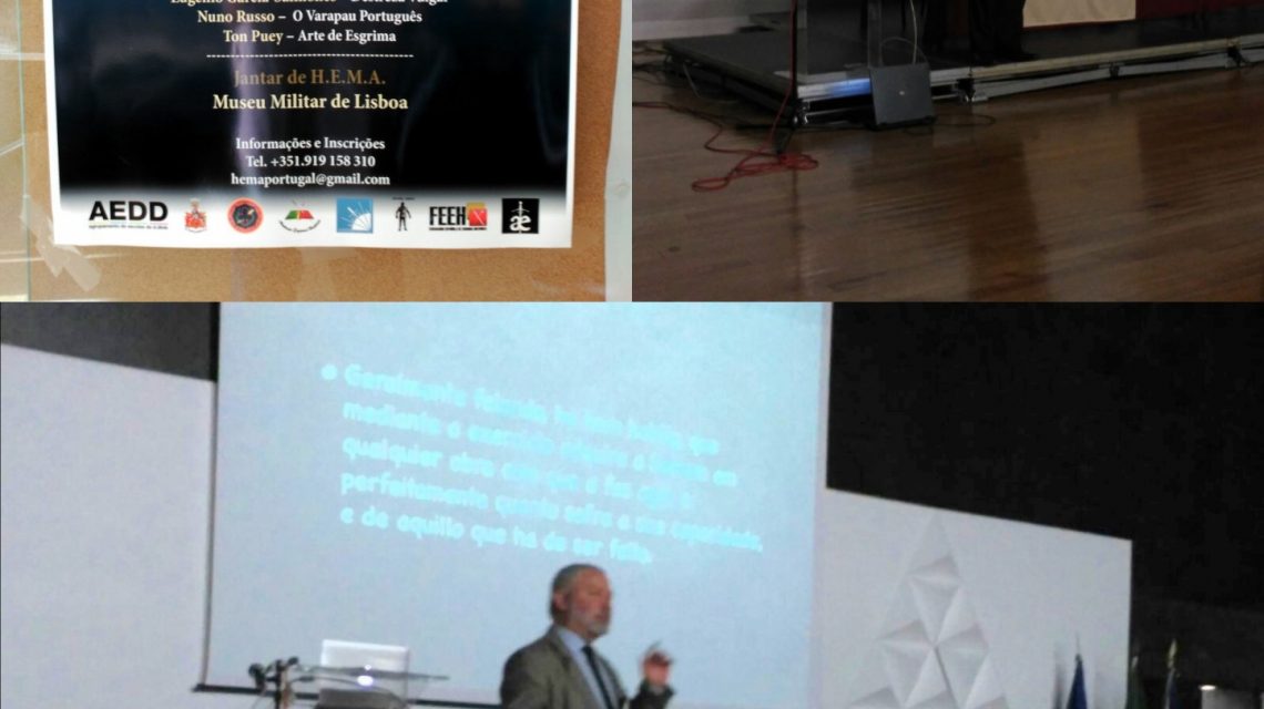 Os companheiros Manuel Valle Ortiz e Ton Puey foram convidados pela HEMA-Portugal para ministrar uma conferência e uma aula prática no encontro anual daquela federação portuguesa de artes marciais ocidentais que teve lugar os dias 4, 5 e 6 de Novembro em Lisboa. Aproveitando a viagem, fizeram várias visitas às instituições com que a AGEA Editora colabora para a recuperação de tratados históricos de esgrima portuguesa. Velaí uma pequena crônica de essa viagem: