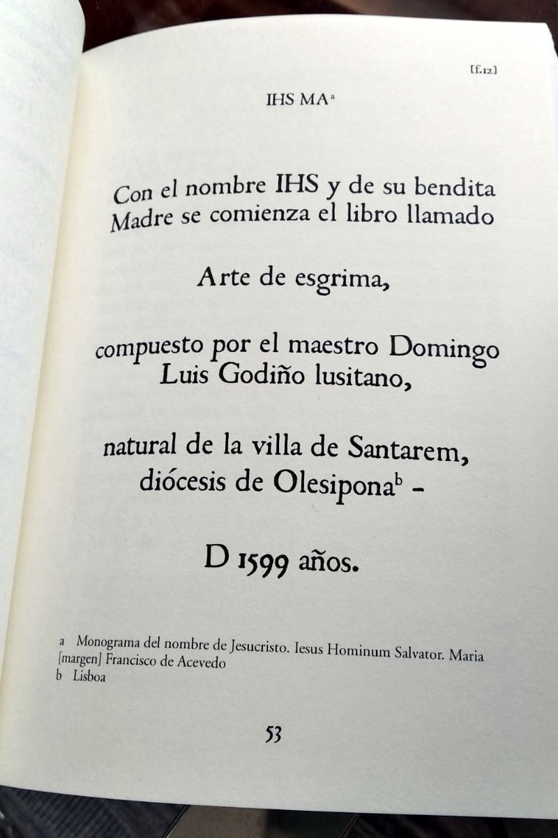 In 1599, during the period when the Portuguese crown was united to the crowns of Castile and Aragon, a Portuguese master called Domingo Luis Godinho wrote a manuscript in Spanish entitled Arte de Esgrima (The Art of Fencing). The book was never published, and almost nothing is known about its author’s life beyond him being born in Santarém. However, the text is of utmost relevance in the study of Iberian schools of fencing, since it is the single complete treatise discovered so far describing the old style, the one to be displaced by the apogee of Verdadeira Destreza.