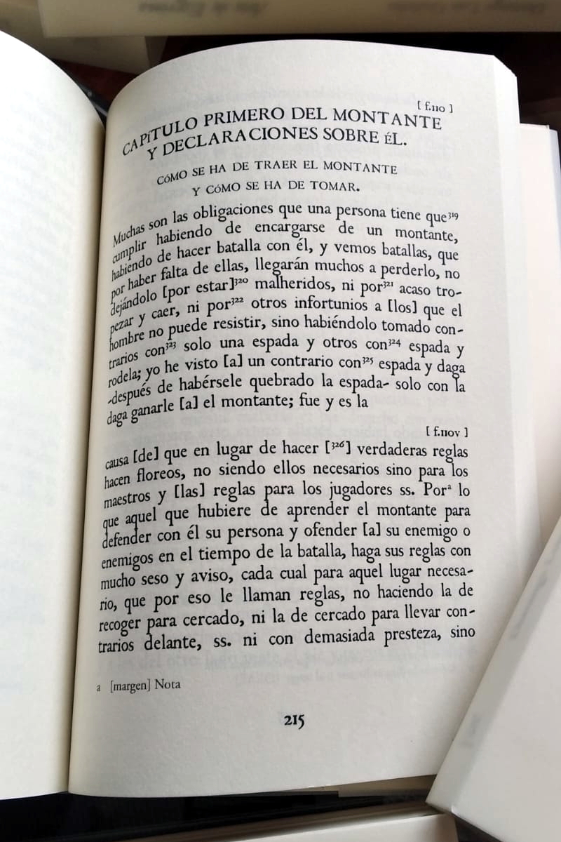 The work, originally written in 137 folios that we present as in 291 pages in this current edition, includes instructions for the single sword, sword and rotella, sword and buckler, twin swords, sword and dagger, sword and cape, plus the longest known text on the use of the iberian montante.