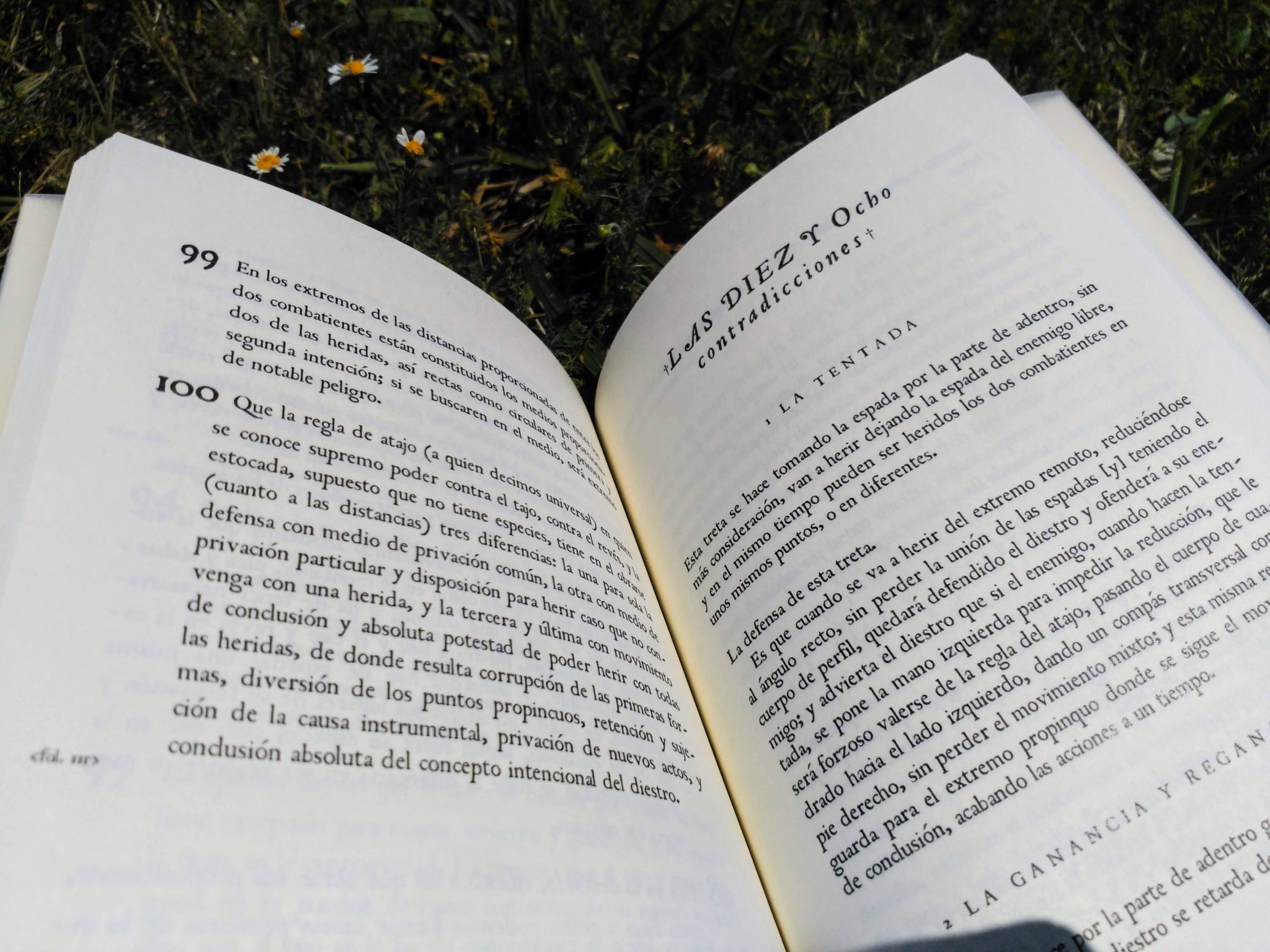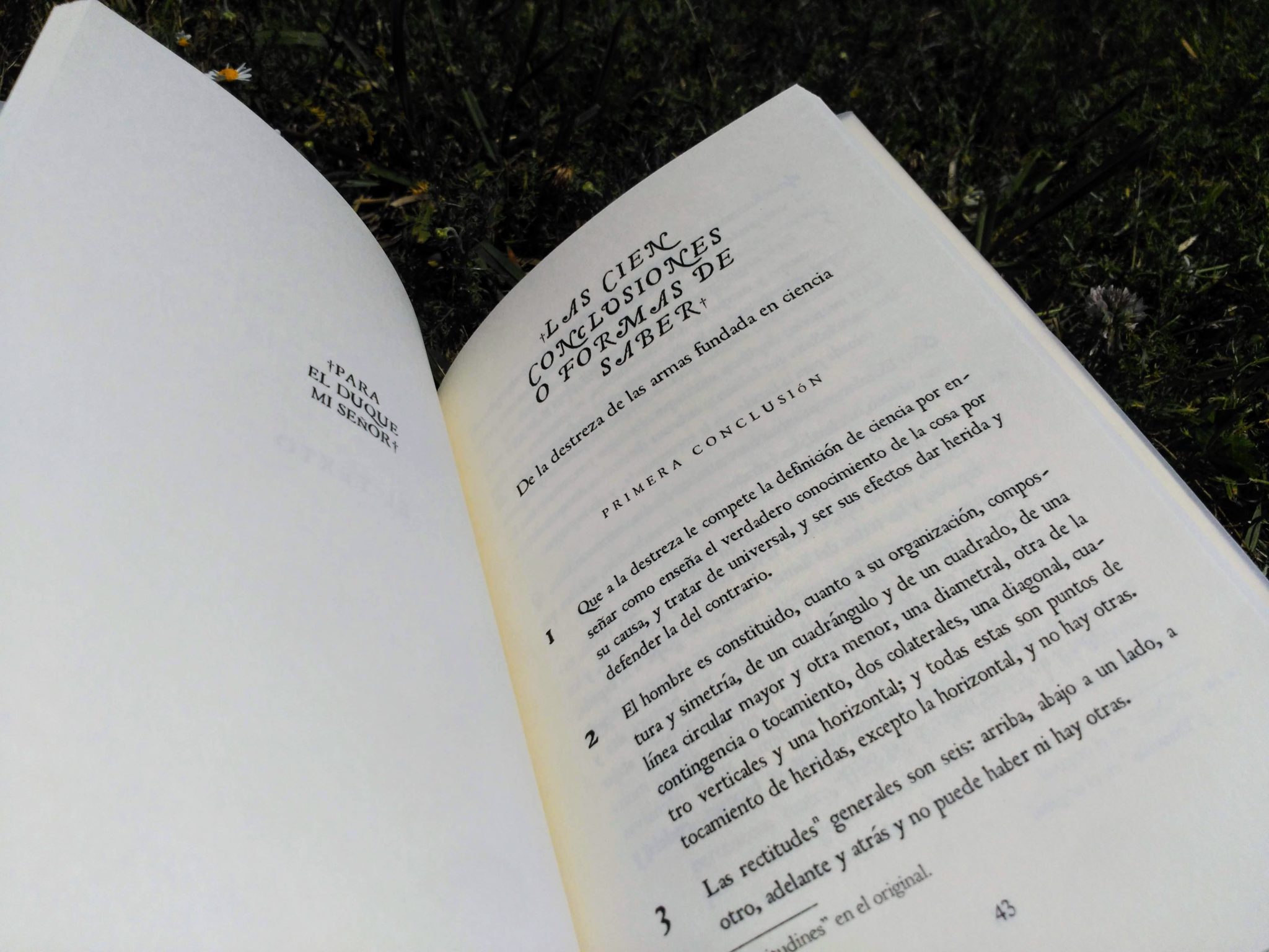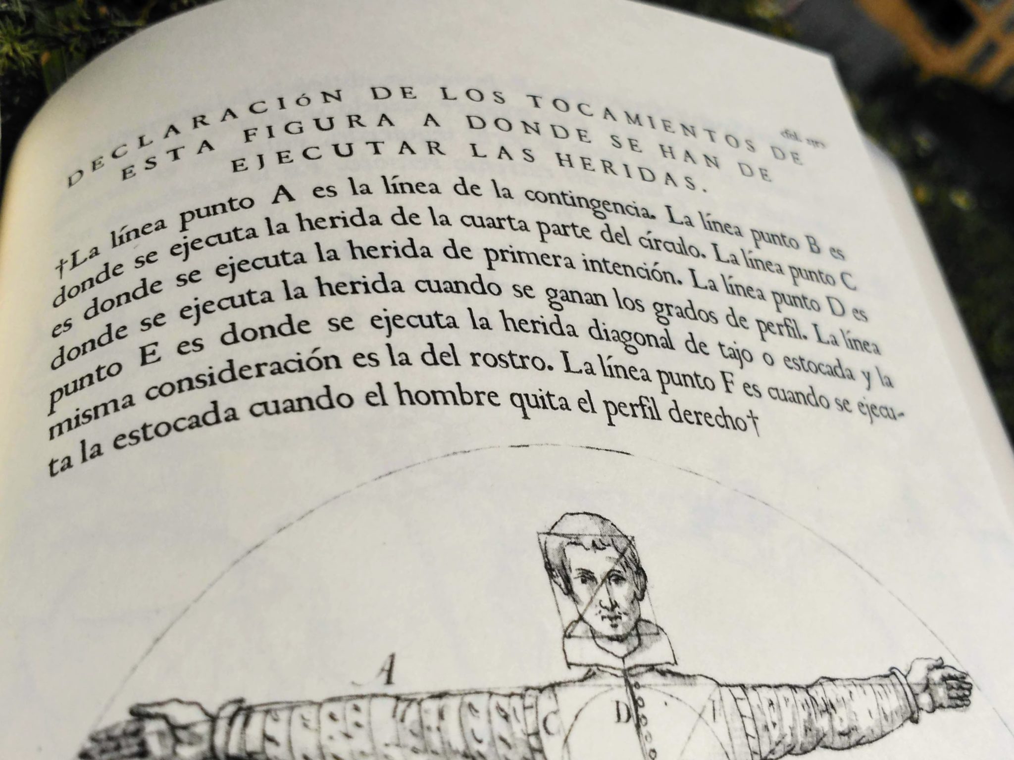 In addition to the Conclusiones and Contradicciones, the book includes a section describing the «tretas» of the Verdadeira Destreza, a series of definitions in the form of a question-answer dialog, and an explanation with illustrations of footwork, body lines, right angle, the medio proporcionado, the execution of the atalho and the movement of conclusion.