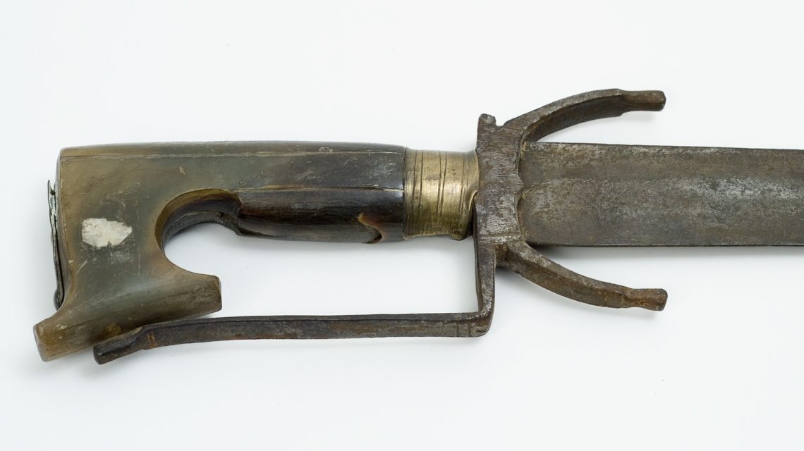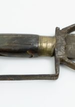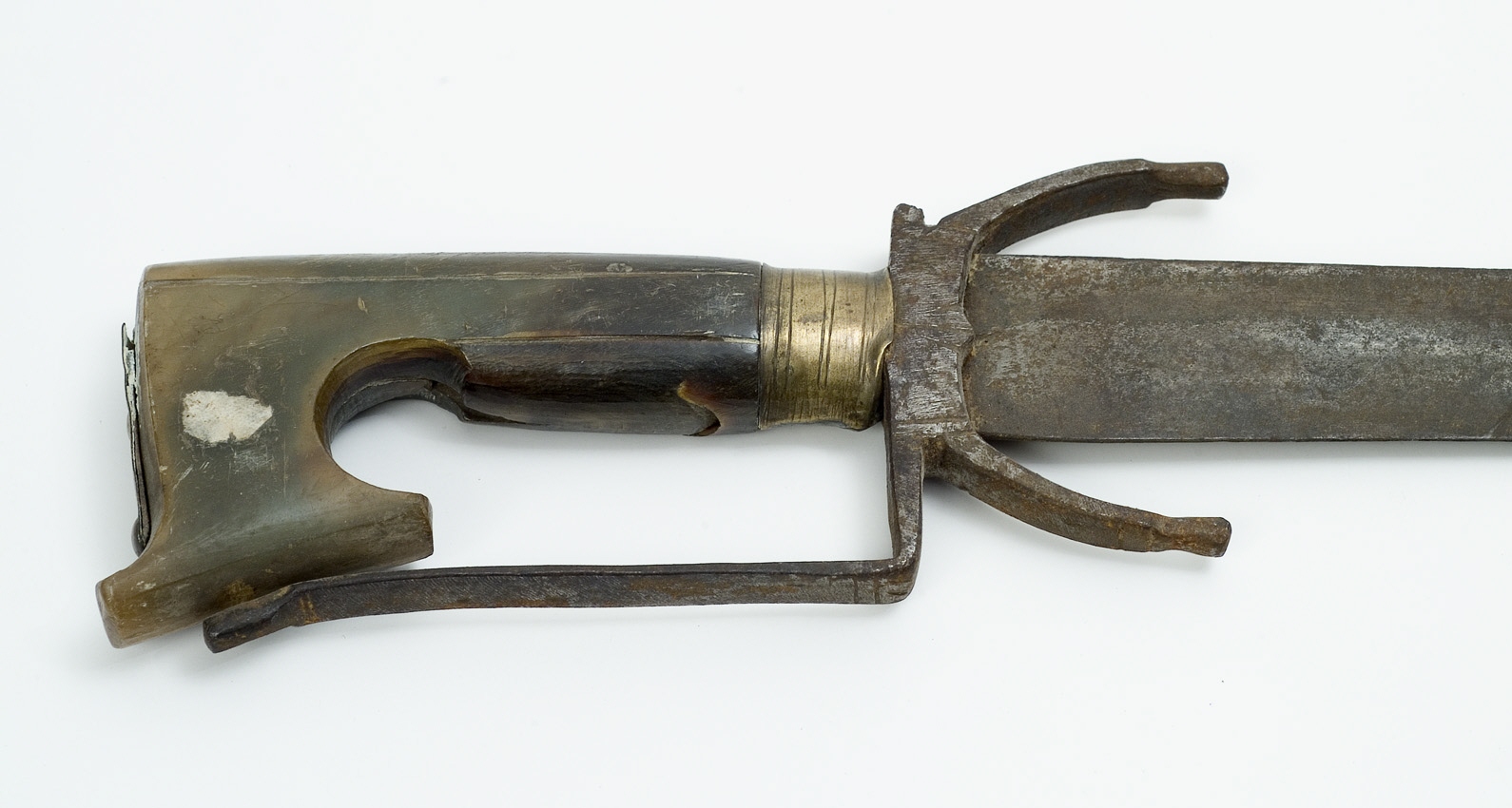 - Description: made of carved horn, it has a ring of golden brass in the junction with the guard.